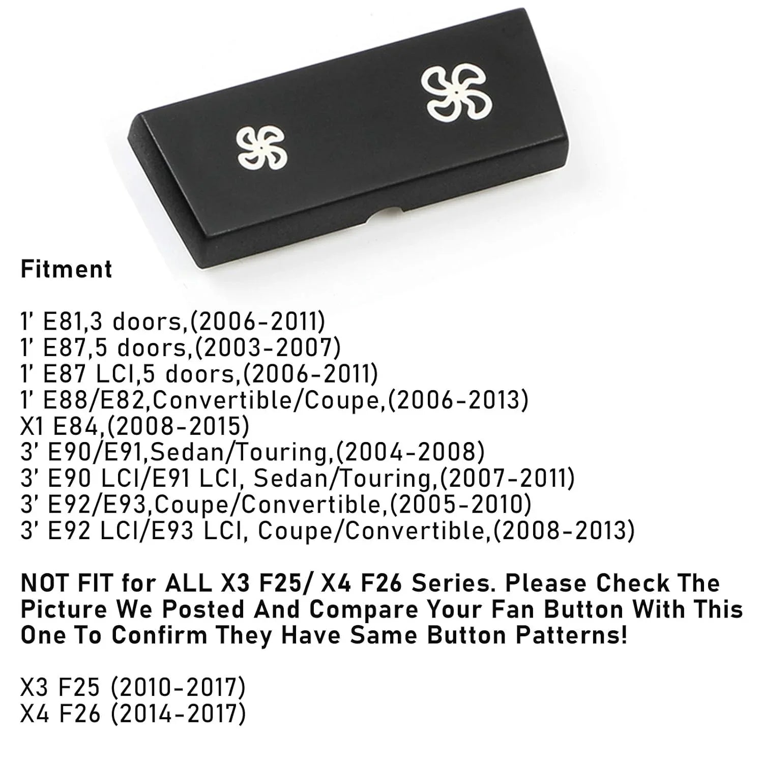 Compatible con BMW Serie 1 E81/E87/E88/E82, Serie 3 E90/E91/E92/E93, X1 E84, X3 F25, X4 F26. Nota: No es compatible con todos los modelos X3 F25/X4 F26. Por favor, revise atentamente las imágenes y compare el patrón de los botones de velocidad del ventilador para asegurar una compatibilidad perfecta antes de realizar su pedido.
