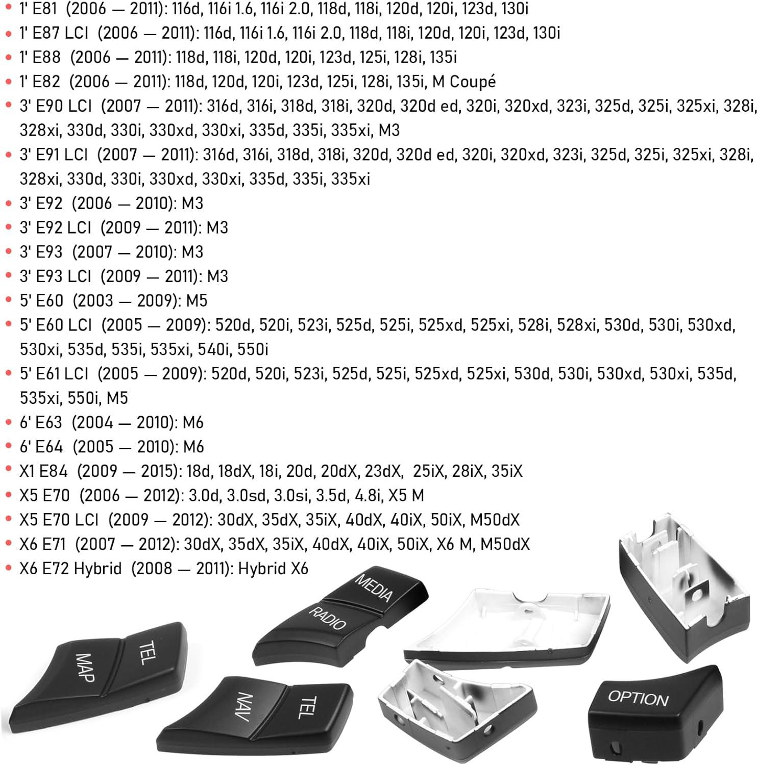 Fitment: iDrive Multimedia Control Button Replacement Kit compatible with BMW 1 Series E81 E82 E88 (2006-2011), 3 Series E90 E92 E93 (2007-2011), 5 Series E60 E61 (2003-2019), 6 Series E63 E64 (2004-2010), X1 E84 (2009-2015), X5 E70 (2006-2012), and X6 E71 (2007-2012).