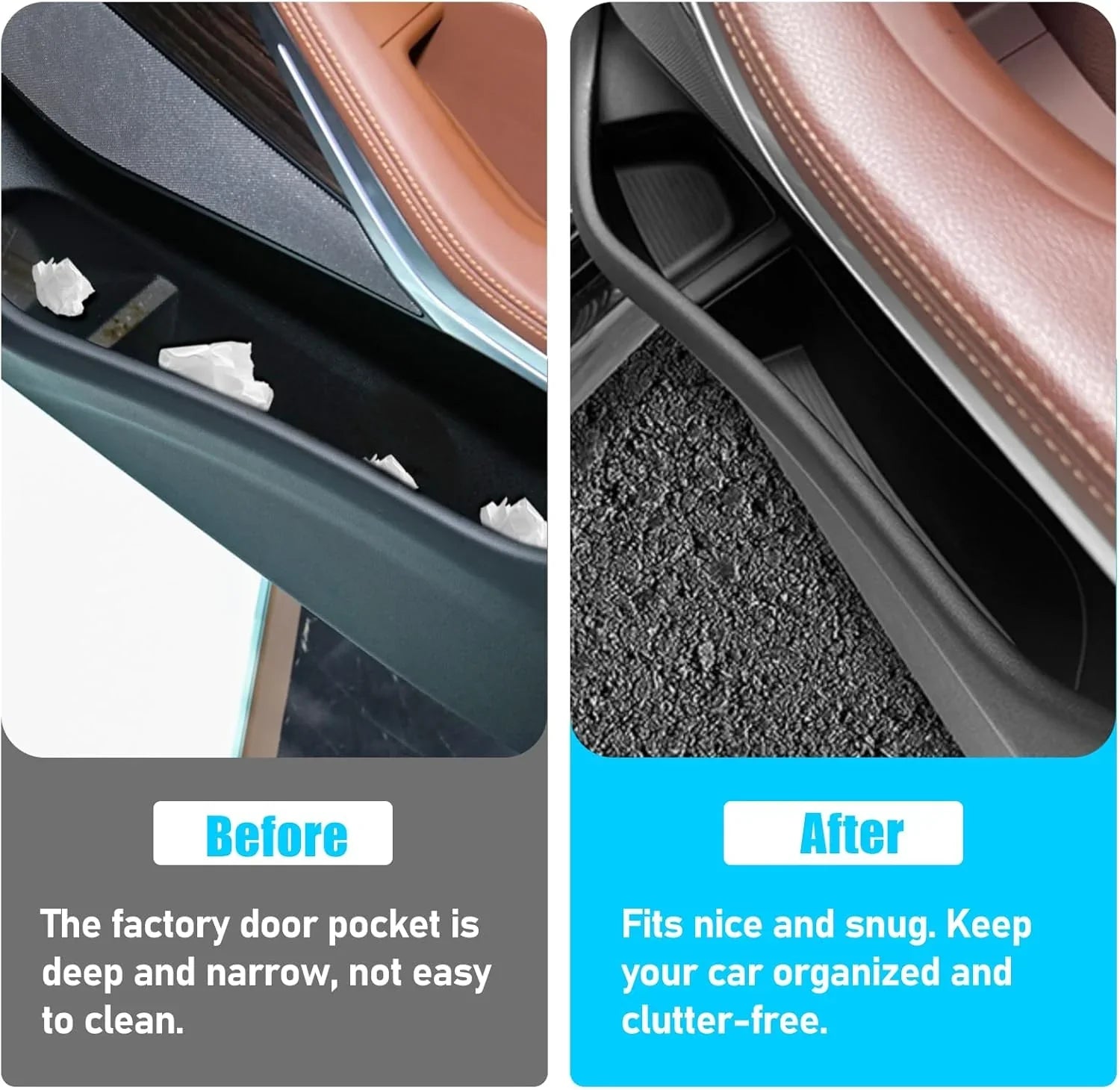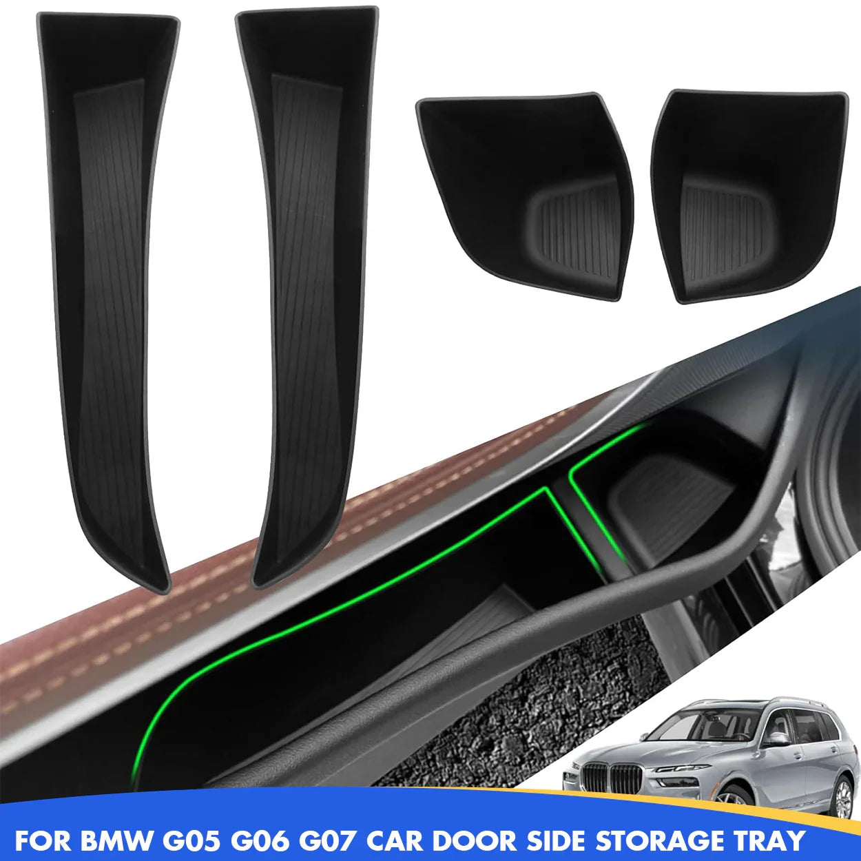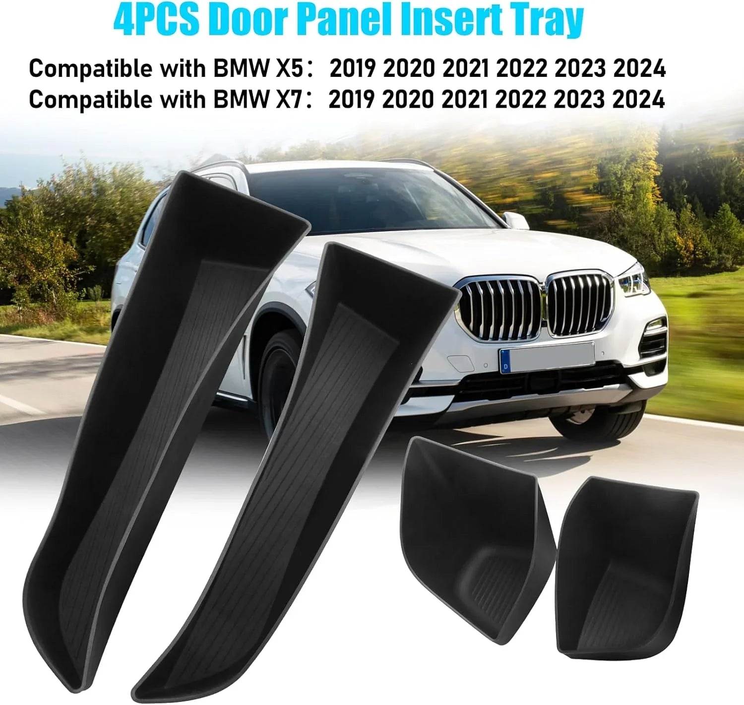 Custom-designed to fit the front doors of BMW X5 G05 and X7 G07 models from 2019 to 2024. The organizer tray fits securely in the door pocket without sliding or rattling, ensuring a snug fit and stable use even while driving.