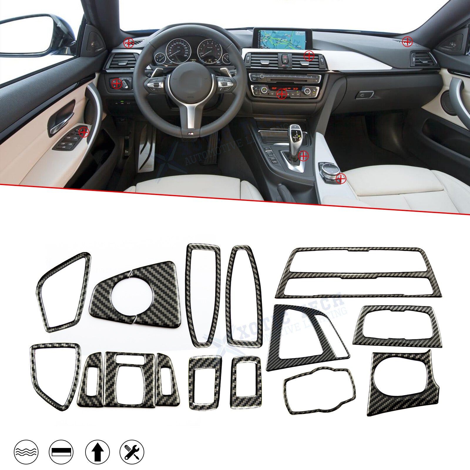 This complete interior overlay kit includes 15 precisely molded real carbon fiber trim pieces designed to upgrade the look of your BMW 3 Series (F30/F31/GT F34) and 4 Series (F32/F33/F36) from 2013–2017. Adds a premium and sporty touch to your cabin.