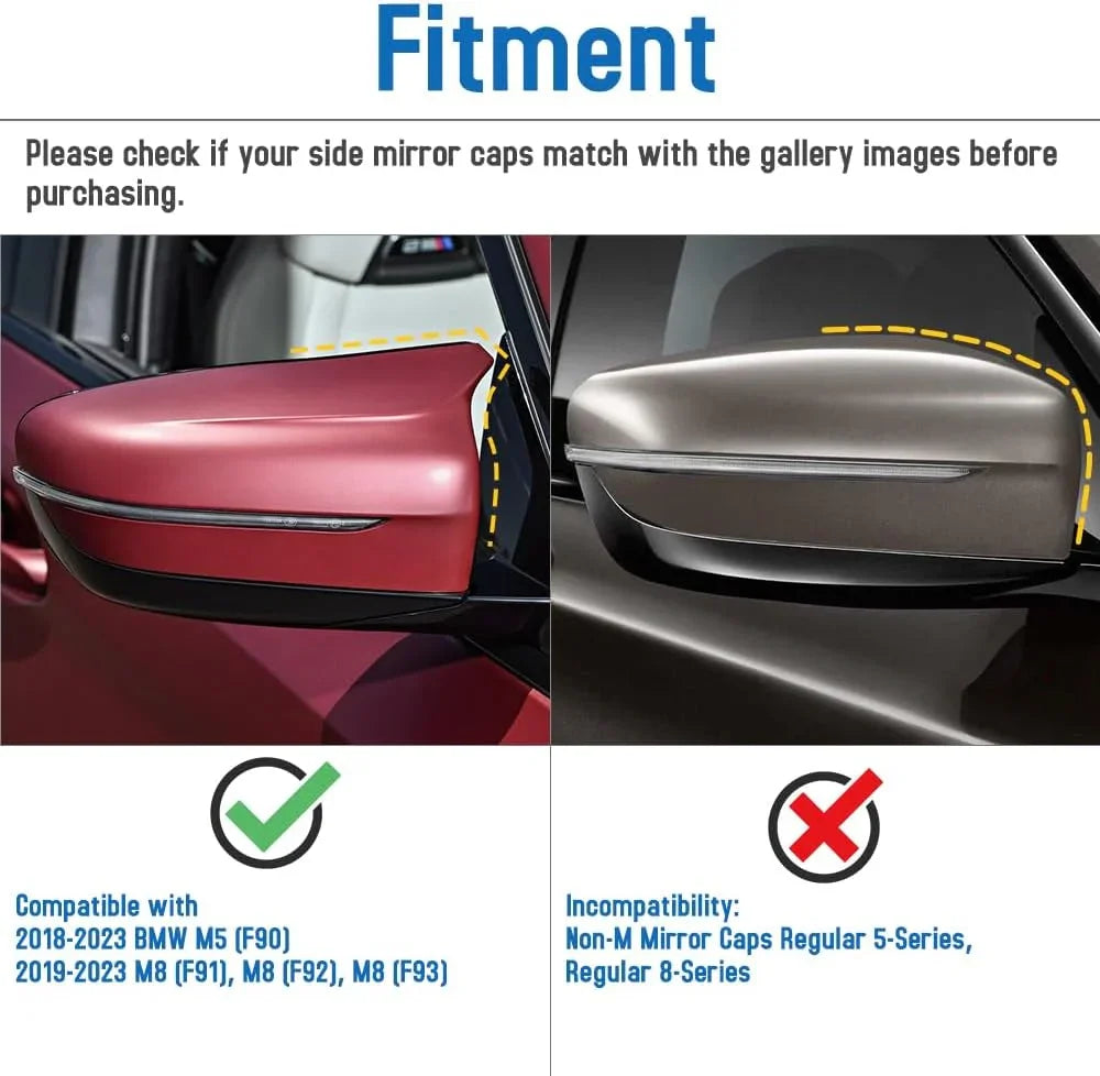 Sporty Appearance: Enhance the appearance of your BMW M5 or M8 with premium carbon fiber mirror cap overlays. These are made from real dry-molded carbon fiber, adding a sporty and elegant touch to your vehicle.