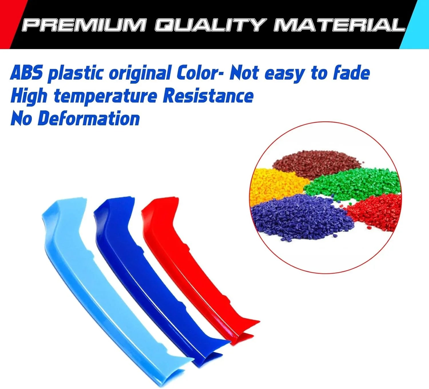 • Perfect Fit: These M-colored tri-grille insert trims are designed for the driver side grille, featuring a striking color sequence starting from the 2nd (red), 3rd (dark blue), and 4th (light blue) beams from the right side.