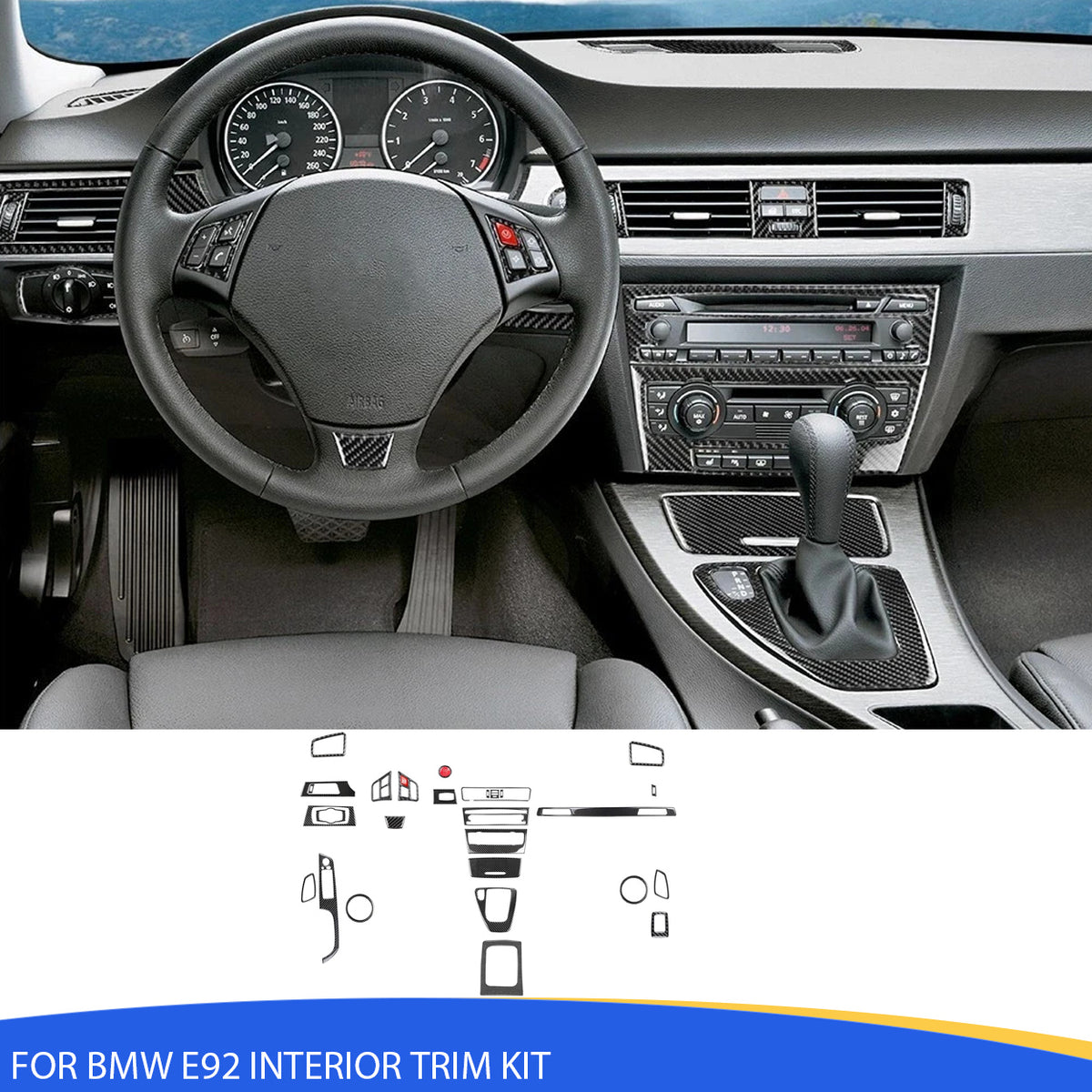 Engineered for BMW 3 Series M3 E92 left-hand drive models from 2007 to 2013. This kit precisely fits over the original dashboard, console, and button areas with no modification required.
